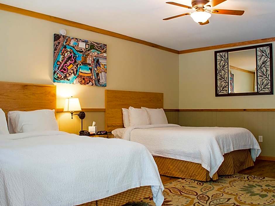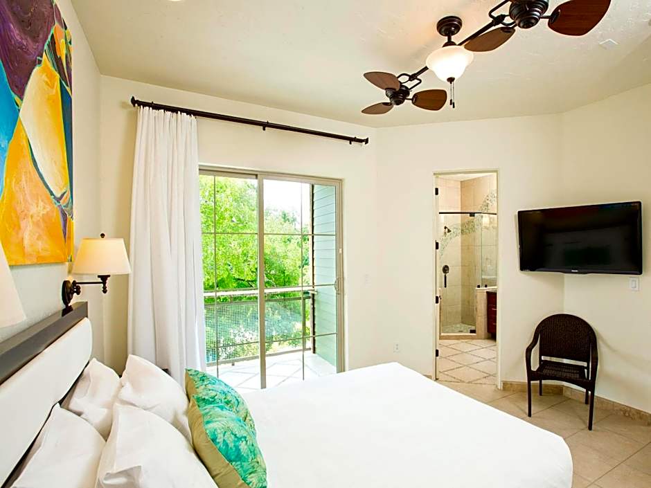 Overlooking the Comal River, this loft features 2 bedrooms, each with a large double-sized bed, and 2 bathrooms. The living room offers a leather sofa that unfolds into 2 single beds. A spacious private patio has views of the Comal River and the Surfenburg area.